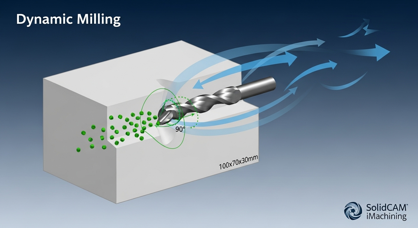 iMachining의 두뇌 역할을 하는 이 기능은 사용자가 입력한 재료, 공구, 공작기계 정보를 바탕으로 최적의 절삭 속도, 이송 속도, 스텝오버 등을 자동으로 계산해줍니다. 오퍼레이터는 더 이상 복잡한 계산에 시간을 낭비할 필요 없이, 몇 번의 클릭만으로 최적화된 조건을 얻을 수 있습니다. 저는 이 기능 덕분에 초보자도 전문가처럼 가공할 수 있다는 점이 가장 큰 장점이라고 생각합니다. - Dynamic Milling (다이내믹 밀링):