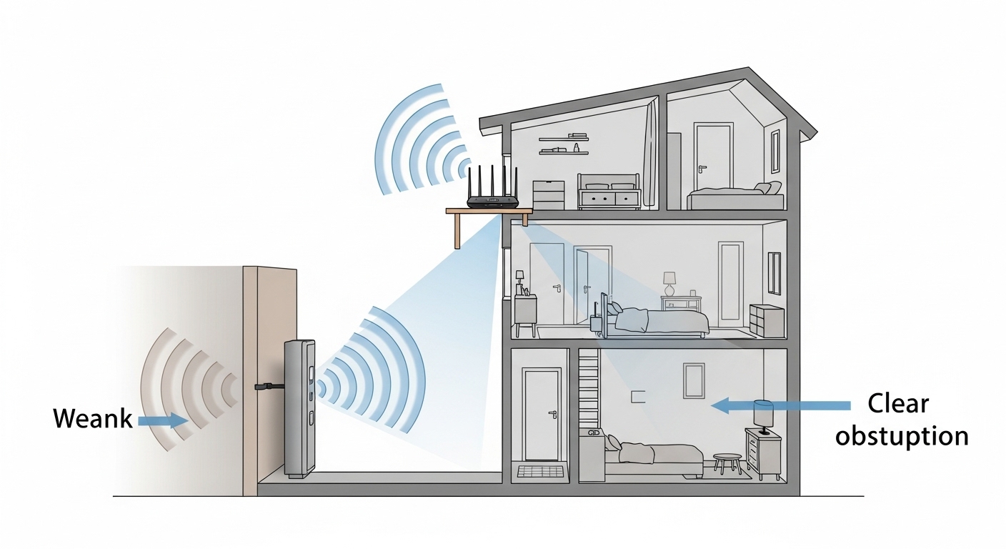 와이파이 신호는 전파이기 때문에 주변 환경의 영향을 크게 받습니다. 공유기가 어디에 놓여있느냐에 따라 집 전체의 와이파이 커버리지와 속도가 천차만별로 달라질 수 있어요. 집안에서 와이파이 신호가 가장 잘 전달될 수 있는 '명당'을 찾아주는 것이 두 번째 비법입니다.