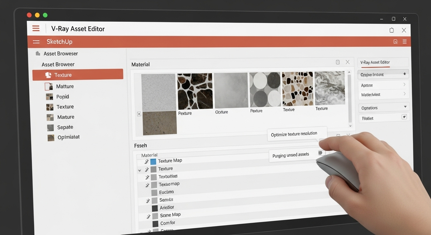 V-RAY 렌더링 이전에, 스케치업 모델 자체를 가볍게 만드는 것이 가장 기본입니다. 불필요한 선, 면, 숨겨진 지오메트리는 렌더링 부하를 증가시켜요. 저는 항상 컴포넌트와 그룹을 적극적으로 활용해서 비슷한 객체들을 효율적으로 관리하고, 'Purge Unused' 기능으로 사용되지 않는 구성요소를 주기적으로 삭제해 줍니다. 특히 외부에서 가져온 복잡한 모델은 단순화하거나 프록시로 대체하는 습관을 들이는 것이 좋습니다.